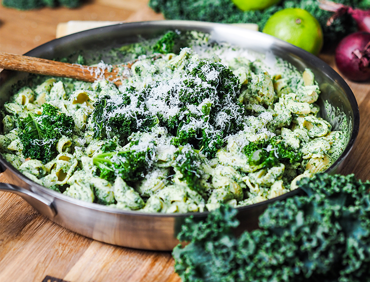- In einem hitzebeständigen Mixer (oder mit Hilfe eines Pürierstabes) Grünkohl-Mischung mit Ricotta, Salz und Pfeffer und Zitrussaft cremig pürieren. Wer mag, kann ein paar Grünkohlblätter beiseite legen und damit die Pasta später garnieren.