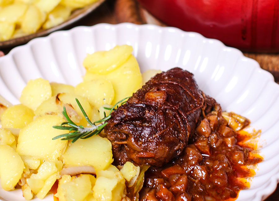 • Nun die Rouladen wieder in den Topf geben und auf der mittleren Schiene für 90 Minuten in den vorgeheizten Ofen backen. Sobald die Rouladen schön weich sind, den Topf aus dem Ofen nehmen, Rouladen in eine Ofenform legen und warm halten.